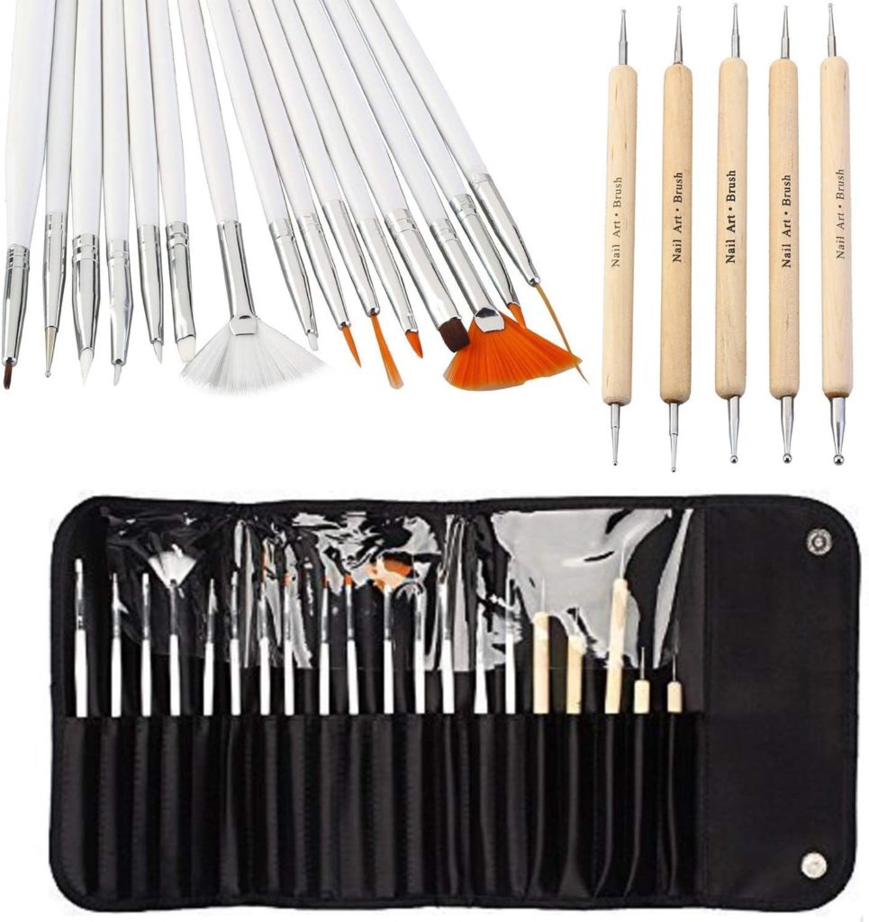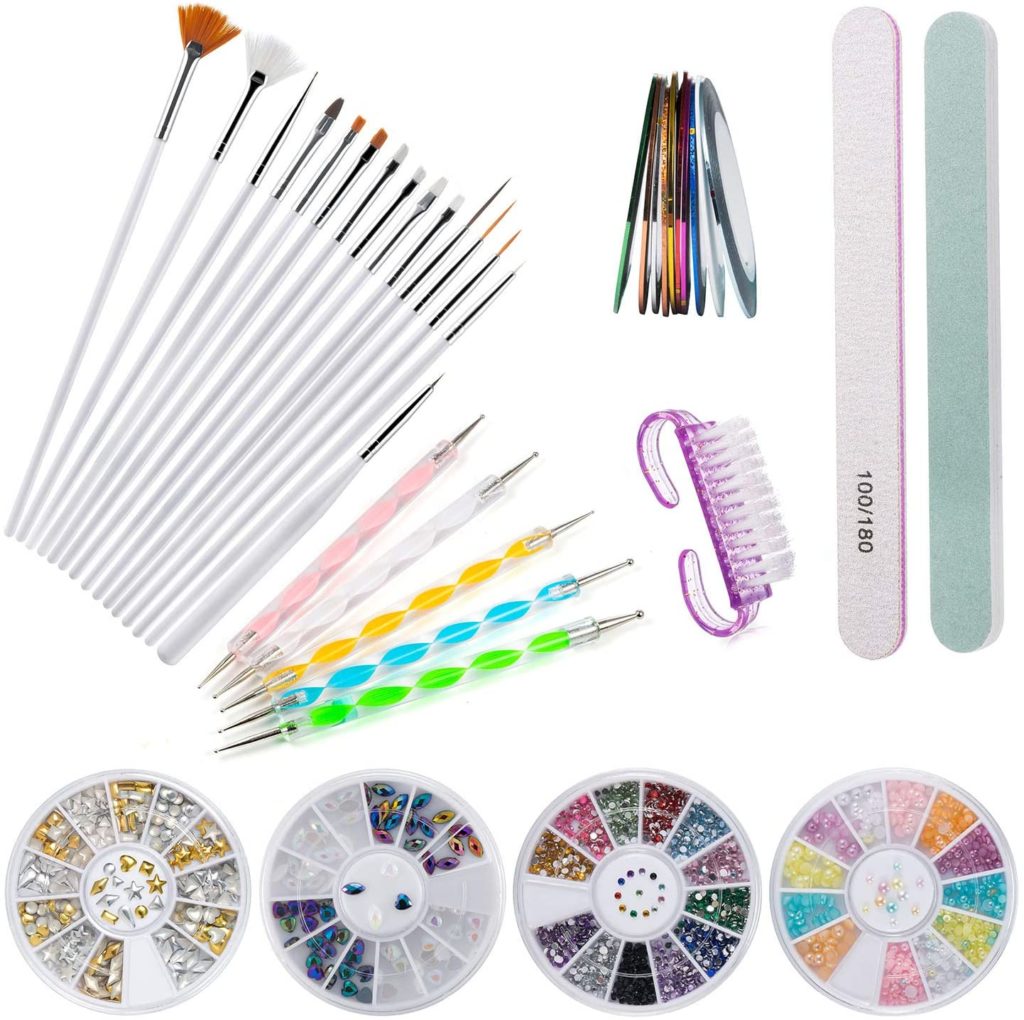 Para aquellos que disfrutan decorando sus uñas con dibujos y piedrecitas este kit es muy útil. Incluye 15 pinceles de uñas, 4 cajitas con pedrería, un cepillo, cinco bolígrafos, 10 rollos de cinta de rayas con colores surtidos, 1 lima y un pulidor de uñas. Gracias a los pinceles de diversos grosores y formas, se pueden pintar rayas finas, flores, hojas, puntos…