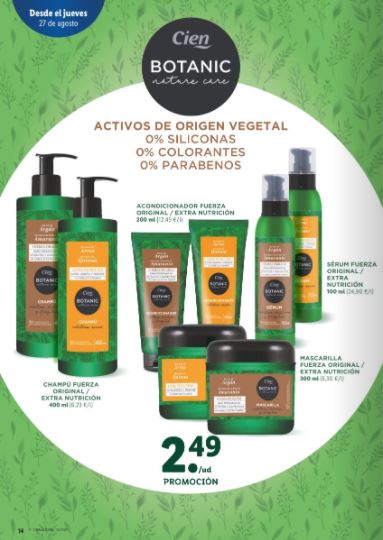 En esta ocasión, Botanic se centra exclusivamente en el cuidado del cabello. Esta gama de productos se compone de champú, mascarilla y acondicionador, existiendo dos versiones de cada producto, fuerza original y extra nutrición. La composición de estos productos es totalmente natural con activos de origen vegetal, sin siliconas, colorantes ni parabenos.