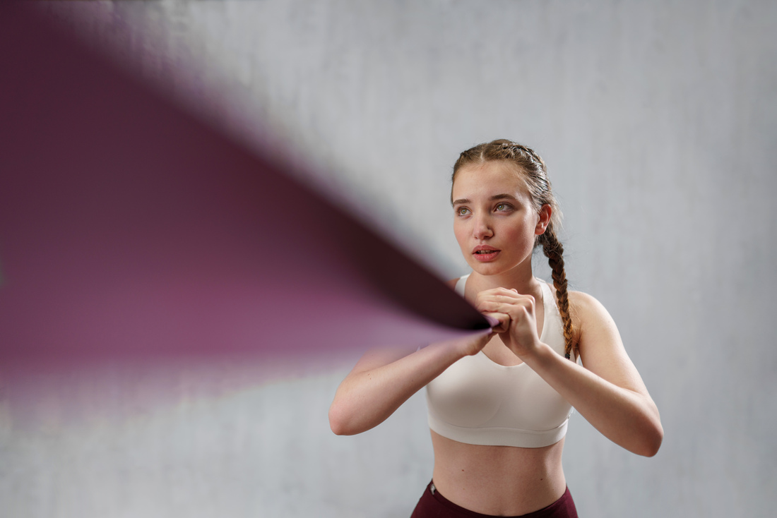 Este es otro de los ejercicios de pecho con gomas para mujeres que te proponemos. Con la cinta colocada de la misma forma que en el ejercicio anterior, ponte de espaldas a la banda de nuevo y coge cada uno de los extremos con una mano diferente. Luego haz fuerza para mover los brazos hacia adelante y hacia atrás; cuando lleves la banda hacia delante y tus manos estén a punto de tocarse, vuelve a separar los brazos y lleva la banda de nuevo a los costados.